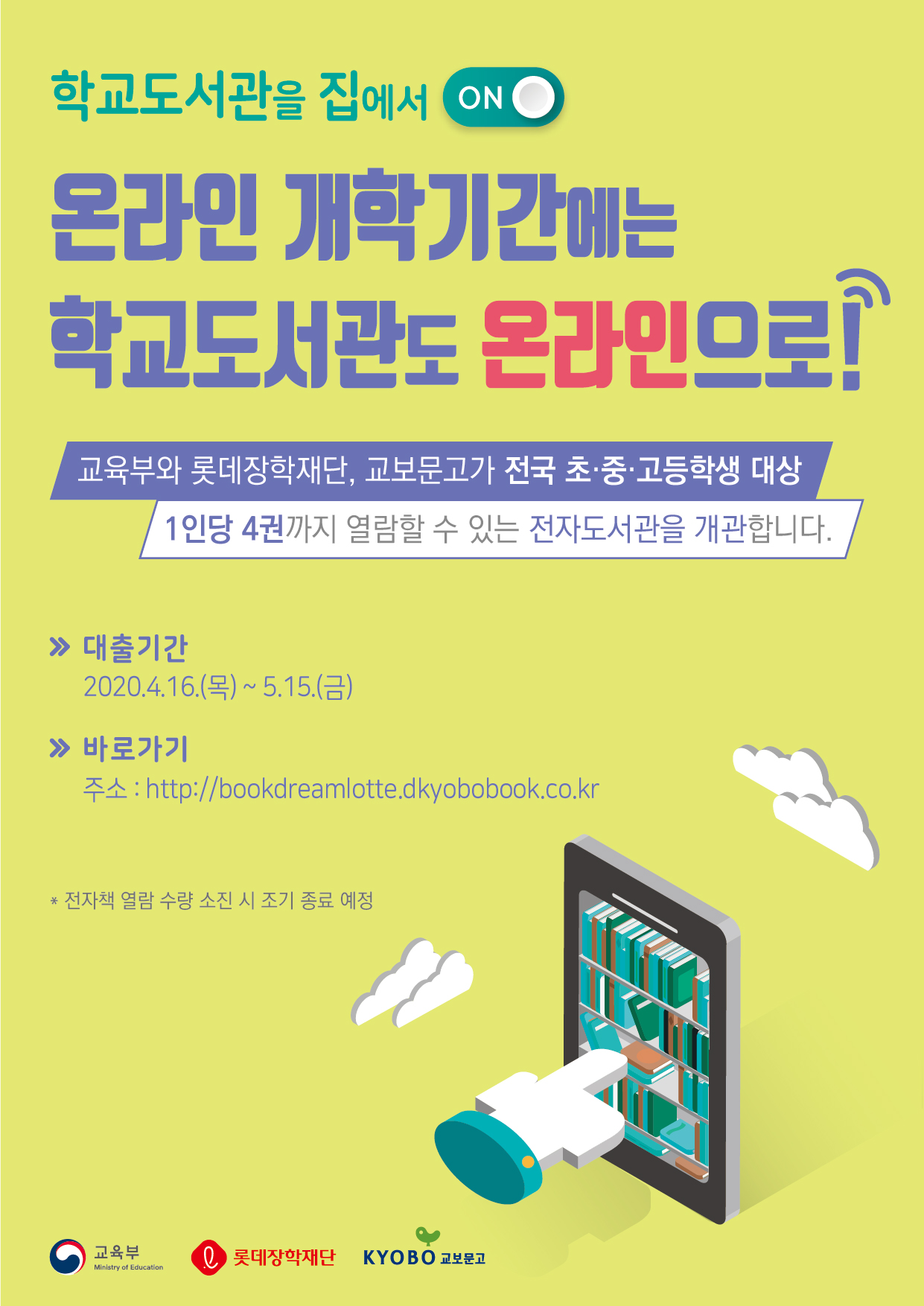 교육부와 롯데장학재단, 교보문고가 전국 초.중.고등학생을 대상으로 1인당 4권까지 열람할 수 있는 전자도서관을 개관하였습니다.