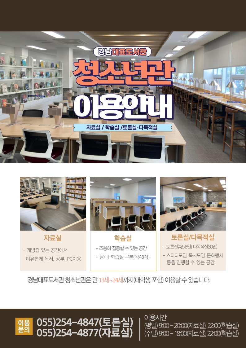○ 위 치 :경남대표도서관 청소년관 2층 ○ 이용시간 : 상시운영(휴관일 제외) * 휴관일 : 매주 금요일 및 법정공휴일 - 자료실 : (평일) 09:00 ~ 20:00, (주말) 09:00 ~ 18:00 - 학습실 : 09:00 ~ 22:00 ○ 대 상 :만 13세 ~ 24세(대학생 이용 가능) 경남대표도서관 정회원(회원증 필수) ○ 이용시설 : 자료실, 학습실(남/여 각 48석), 토론실(4인/8인), 다목적실(30인) ○ 학습실 이용방법 : 무인 좌석발급기 이용 선착순 배치 ○ 모임공간 대여문의 : 경남대표도서관 담당자(☎055-254-4847) |